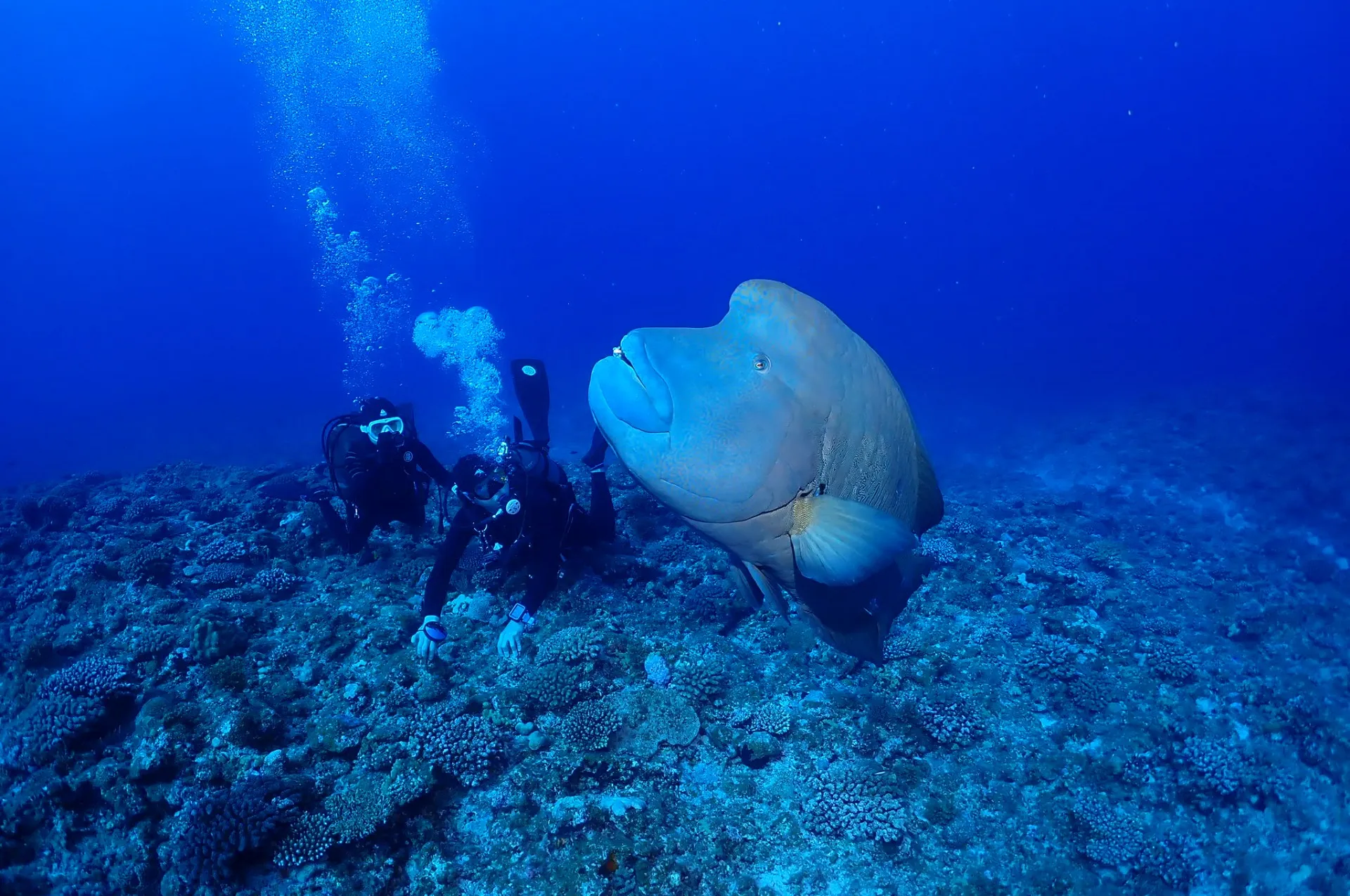 粟国遠征チームは1本目ナポレオンフィッシュから始まりスカスカ10匹ほどのギンガメ味を見て100匹オーバーのイソマグロの群れ見た後沖にでて中くらいのサイズナポレオンフィッシュとマダラトビエイが