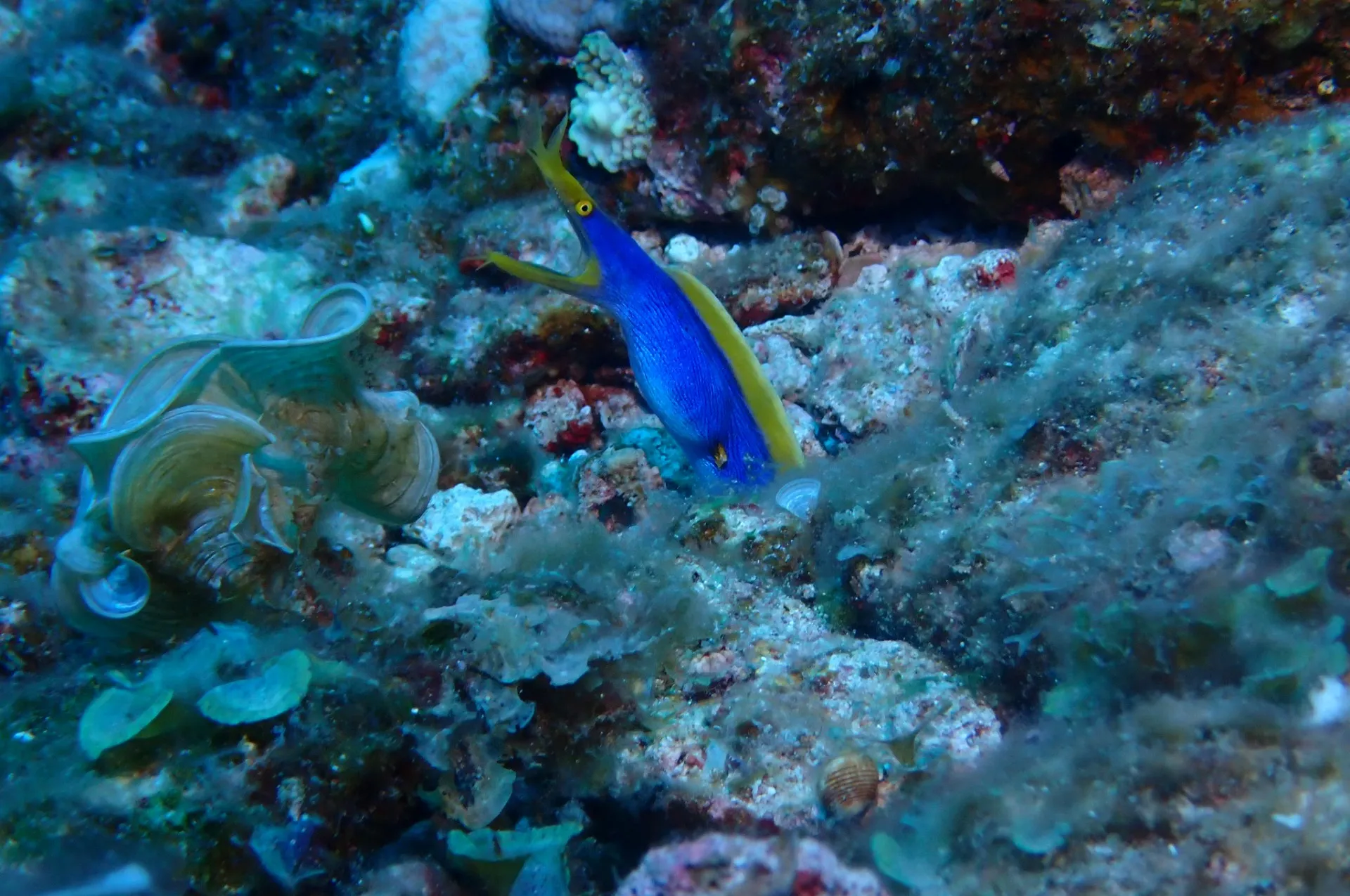 最後は、ロウニンアジと戯れ、魚影を見て、最後はハナヒゲウツボを見て癒されて終了!