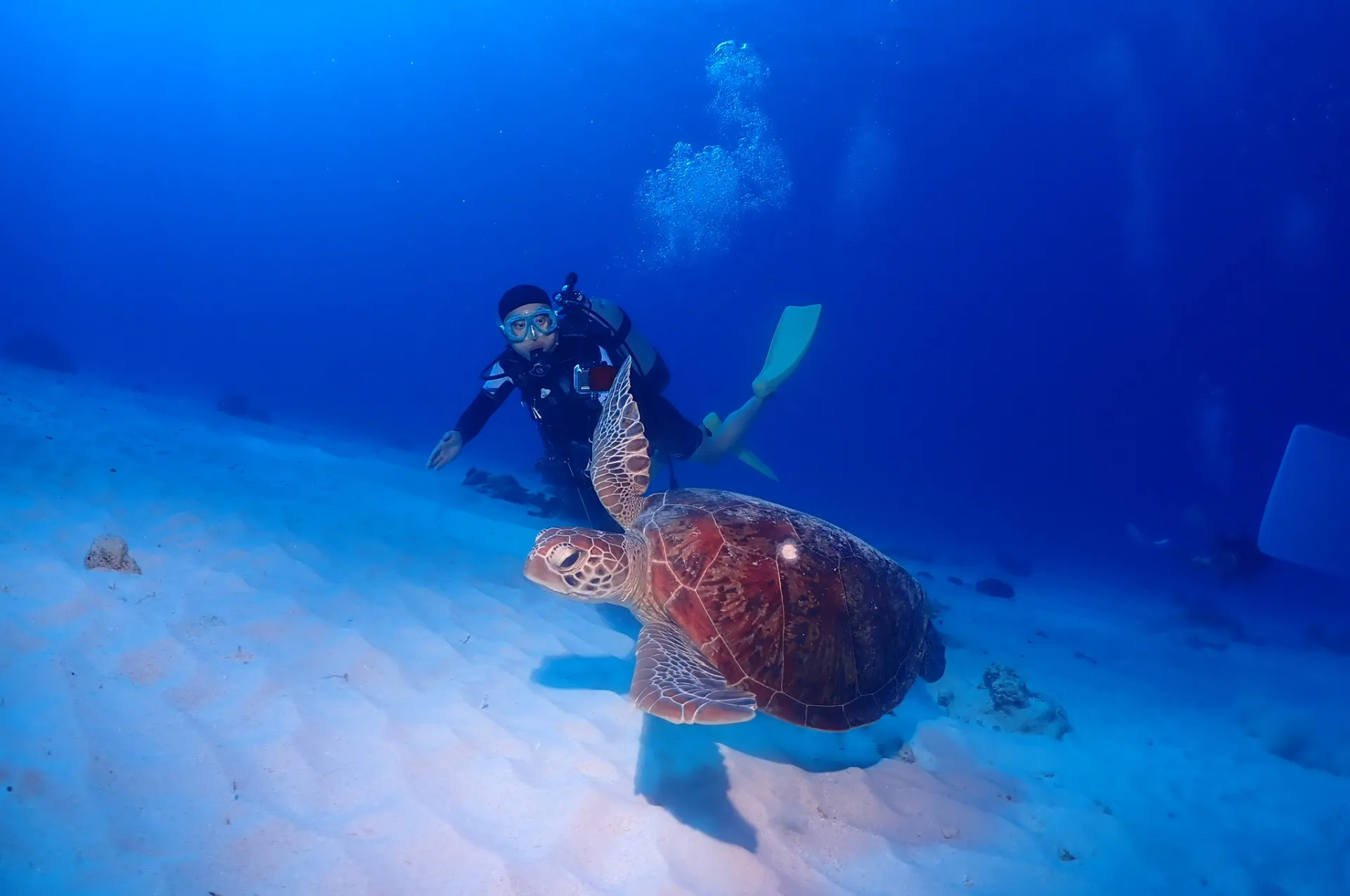 1本目エントリーしてすぐアオウミガメと一緒に泳いで楽しんでからヨスジフエダイやスカシテンジクダイ、キンメモドキなど見てからチンアナゴやナンヨウハギ幼魚を見て楽しんました!