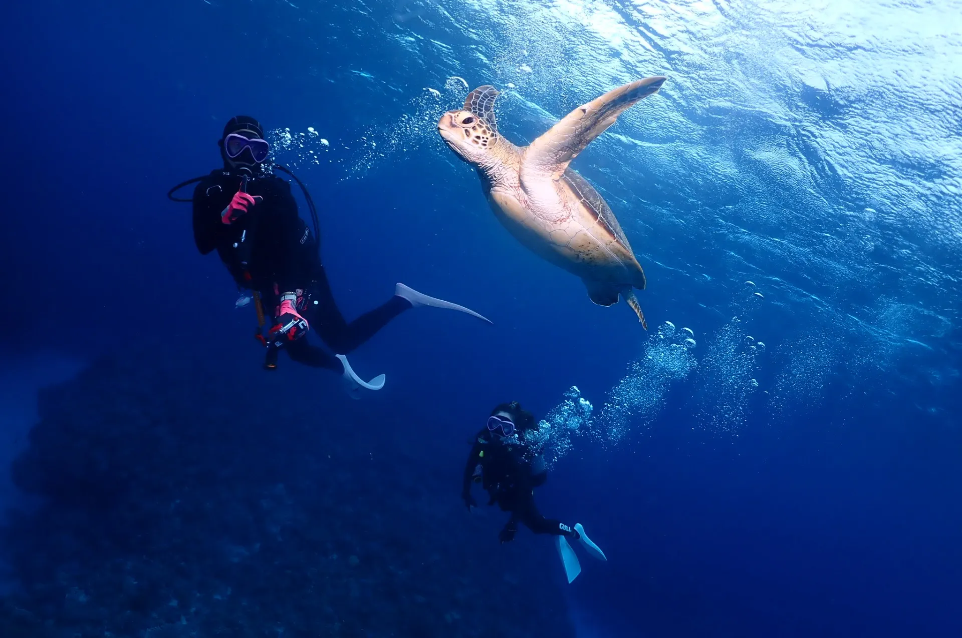 1本目はエントリーしてすぐアオウミガメと一緒泳いで遊んでから地形ダイビング楽しんできました
