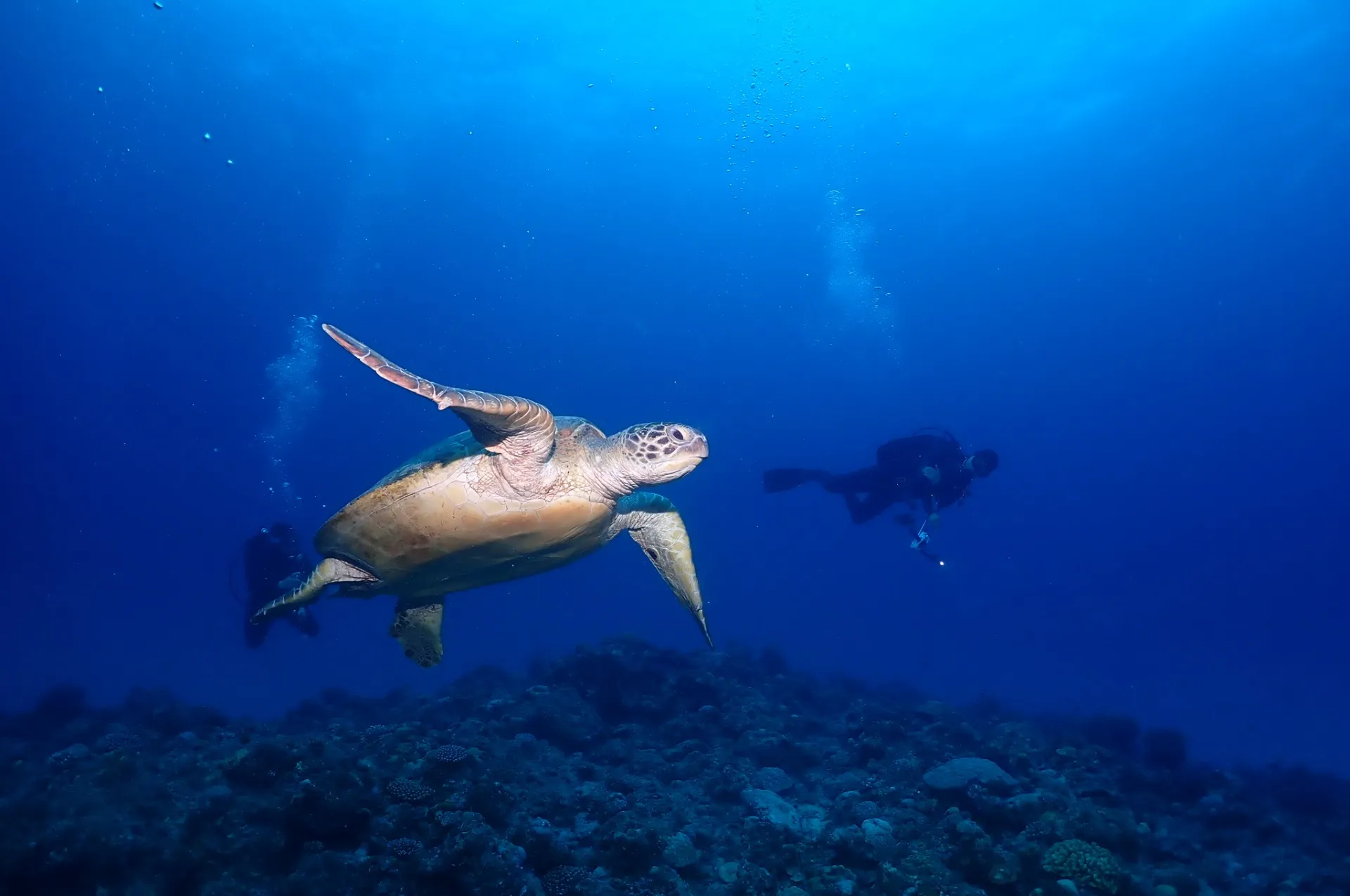 2本目は透明度あまり良くありませんでしたが、大きなアオウミガメにコバンザメが2匹ついていました